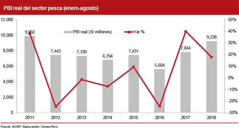 Desde 2017, tras años difíciles para la industria pesquera a causa de factores climáticos desfavorecedores, el sector parece recuperar su dinamismo. De acuerdo con el Informe Técnico de Producción Nacional, elaborado por el Instituto Nacional de Estadística e Informática (INEI), entre enero y agosto de este año, la producción pesquera creció un 17.8% en comparación con el mismo periodo del año anterior, con lo que se posicionó como el sector más dinámico en los ocho primeros meses del año. Este resultado se debió a la mayor captura de especies de origen marítimo (+18.7%) y continental (+0.2%). Así, la pesca de origen marítimo destinada al consumo humano directo creció un 5.4% y la destinada al sector industrial, un 31.3%. Según el Banco Central de Reserva del Perú (BCRP), el adecuado nivel de biomasa y la ausencia de condiciones climáticas extraordinarias favorecieron el desempeño positivo del sector, que alcanzó un 95% de la cuota establecida al cierre de la primera temporada de pesca.