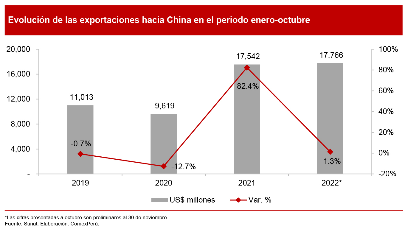 Ante el contexto expuesto, es relevante preguntarnos sobre los posibles efectos en nuestro intercambio comercial con el gigante asiático, pues nuestros envíos hacia este destino en 2021 representaron el 34.4% del total de nuestras exportaciones. Asimismo, en el periodo de enero-octubre de 2022, el valor de nuestras exportaciones a China fue de US$ 17,766 millones, lo cual representó el 33.9% de lo que vendimos al mundo, según cifras de la Sunat.
