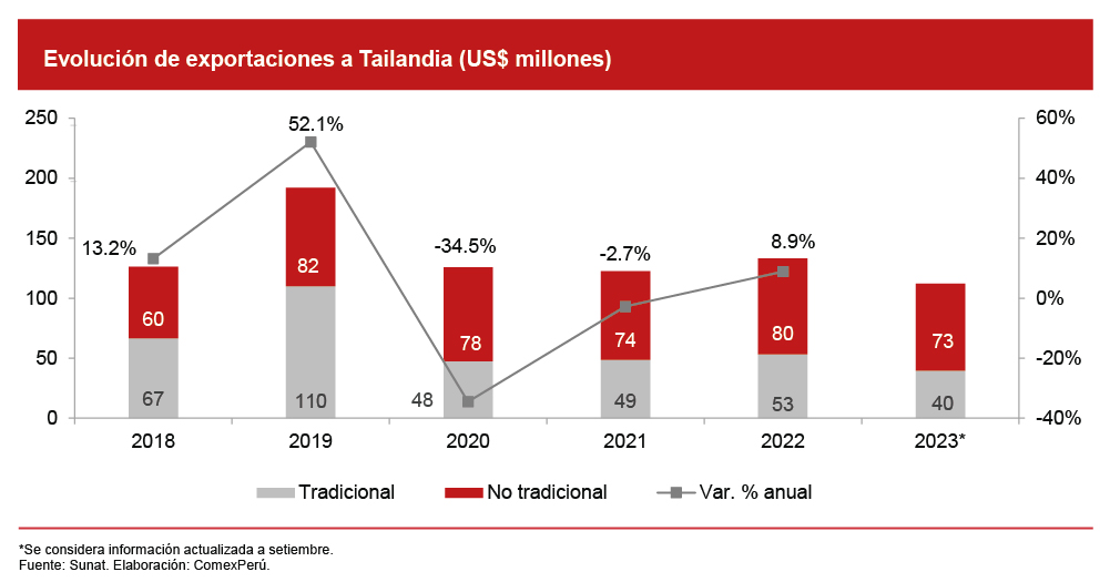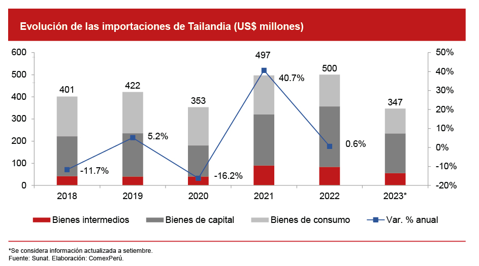 En lo que respecta al periodo enero-setiembre de 2023, nuestras exportaciones al país asiático crecieron un 22.2% y sumaron US$ 112 millones. Los envíos del rubro no tradicional mantuvieron su buen desempeño, con un crecimiento del 43.8%. Destacaron los envíos de calamares y potas congeladas (US$ 56.5 millones, +60.5%), los arándanos frescos (US$ 3.5 millones, +41.3%) y las uvas frescas (US$ 2.5 millones, +107%). Por su parte, nuestras importaciones originarias de Tailandia tuvieron un desempeño contrario, ya que cayeron un 7.4% en comparación con el periodo enero-setiembre de 2022. Los rubros de bienes de capital e intermedios retrocedieron un 16.2% y un 5.3%, respectivamente. Las importaciones de bienes de consumo amortiguaron la caída, al presentar un crecimiento del 9.8% en este periodo.