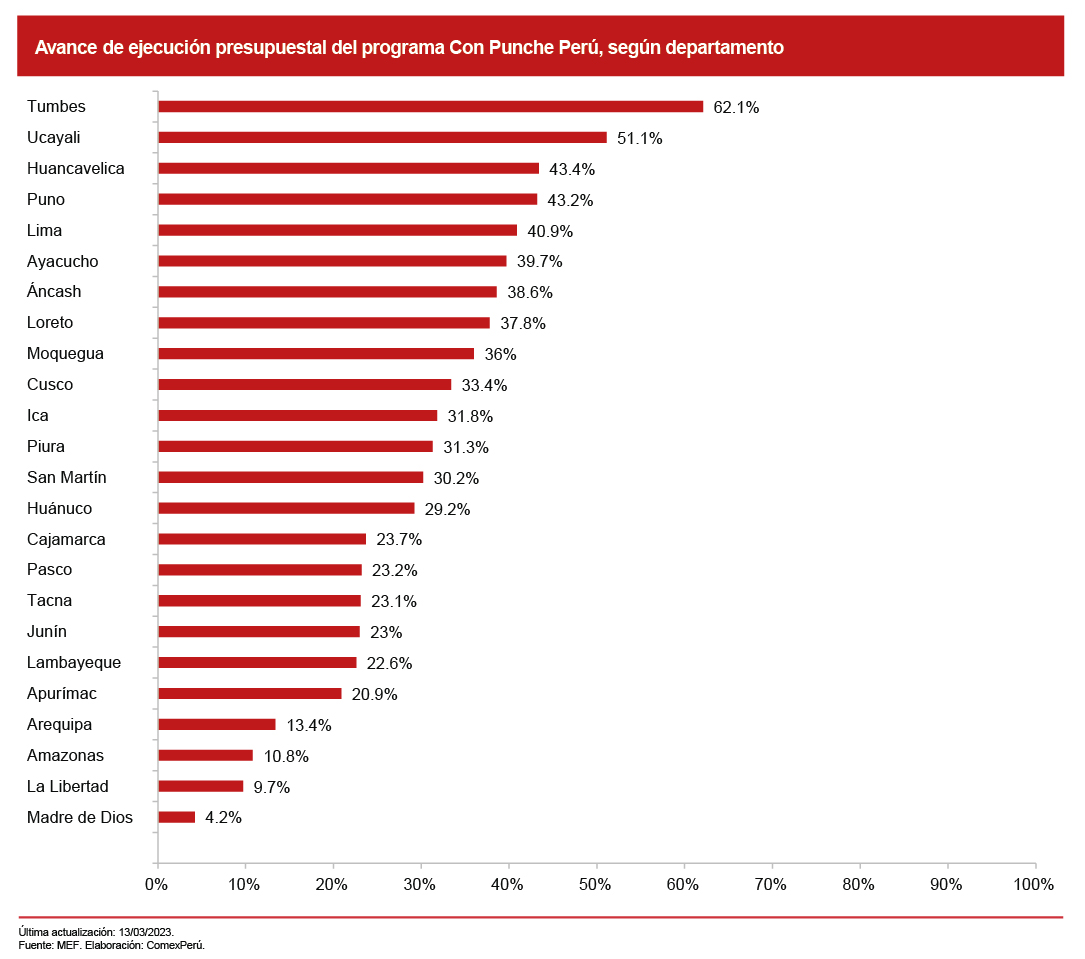 De acuerdo con información del Ministerio de Economía y Finanzas (MEF), al 13 de marzo último, el presupuesto institucional modificado (PIM) del programa Con Punche Perú sumó S/ 3,458 millones hasta marzo, con un avance de ejecución de S/ 1,606 millones, lo que se traduce en una ejecución del 46.5%. Cabe precisar que el plan cuenta con 19 medidas normativas orientadas a la protección social y el impulso y destrabe de inversiones durante seis meses de arduas situaciones climáticas, económicas y sociales, según el MEF.