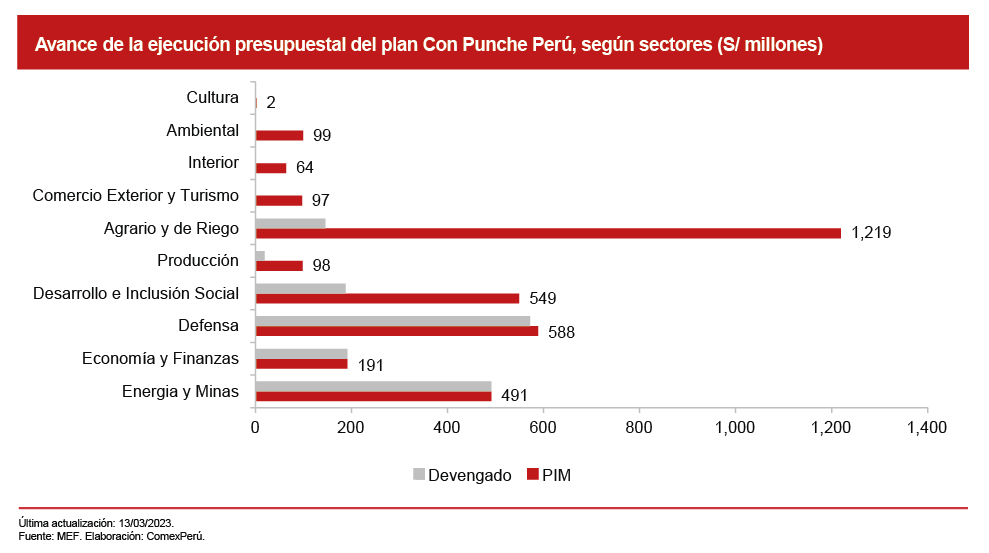 Cerca de finalizar el primer trimestre de 2023, las medidas implementadas por el Gobierno en el marco del plan Con Punche Perú demuestran un avance en determinados sectores, pero aún faltan por ejecutarse en otros como comercio exterior y turismo, y agricultura y riego, por lo que se espera que las autoridades aceleren el proceso de ejecución, de manera que el plan registre un impacto positivo para la reactivación económica en el corto plazo.