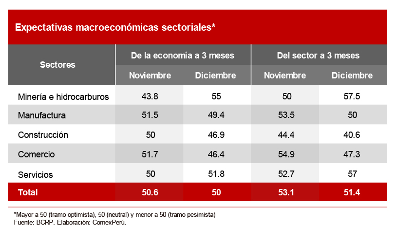 A nivel sectorial, las expectativas empresariales reflejan comportamientos diversos. Los sectores de minería e hidrocarburos y servicios muestran mejoras en su percepción de la economía a tres meses, según los datos del BCRP. Por ello, ambos sectores se ubican en el tramo optimista con puntajes superiores a 50. En contraste, los sectores de manufactura, construcción y comercio redujeron sus expectativas con respecto a noviembre, lo que los llevó al tramo pesimista.