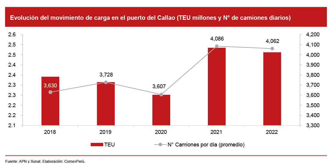 De acuerdo con cifras de la Autoridad Portuaria Nacional (APN), el movimiento de carga contenerizada a través de terminales portuarios de uso público del puerto del Callao ha registrado resultados positivos durante los últimos años (2018-2022), con un crecimiento promedio anual del 1.3%. Asimismo, en 2022, el puerto del Callao movilizó 2,461,193 TEU, lo que representó un aumento del 6.4% respecto de los niveles prepandemia y un 9.4% en comparación con 2020. Sumado a ello, al cierre del primer semestre de 2023, el puerto chalaco movilizó 1,318,391 TEU, lo que reflejó un incremento del 13.8% en comparación con el mismo período del año anterior.
