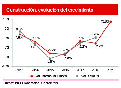 El consumo interno de cemento es uno de los principales indicadores de la contribución del sector privado a la construcción. Durante el mes de junio, este alcanzó una tasa de crecimiento interanual del 11.9%, lo que superó la segunda tasa más alta del año, que fue del 5.4% en marzo. Los principales motores de esta expansión fueron las empresas asociadas a la producción de minería, hidrocarburos, viviendas y centros comerciales. Algunas obras destacables son los proyectos mineros Las Bambas, Mina Justa y la ampliación de la refinería de Talara. Cabe señalar que la última vez que se registró un incremento de esta magnitud fue hace más de cinco años, en mayo de 2013. Además, los últimos datos reportados por el INEI señalan que este crecimiento se habría sostenido en un 11.4% en el mes de julio, por lo cual se prevé que el sector construcción también ha crecido en dicho mes. El aumento observado de mayo a julio, periodo durante el que suelen registrarse tasas de crecimiento pequeñas e incluso negativas en el consumo de cemento, ha sido inusualmente alto este año y se espera que se incremente aún más durante los dos últimos trimestres.