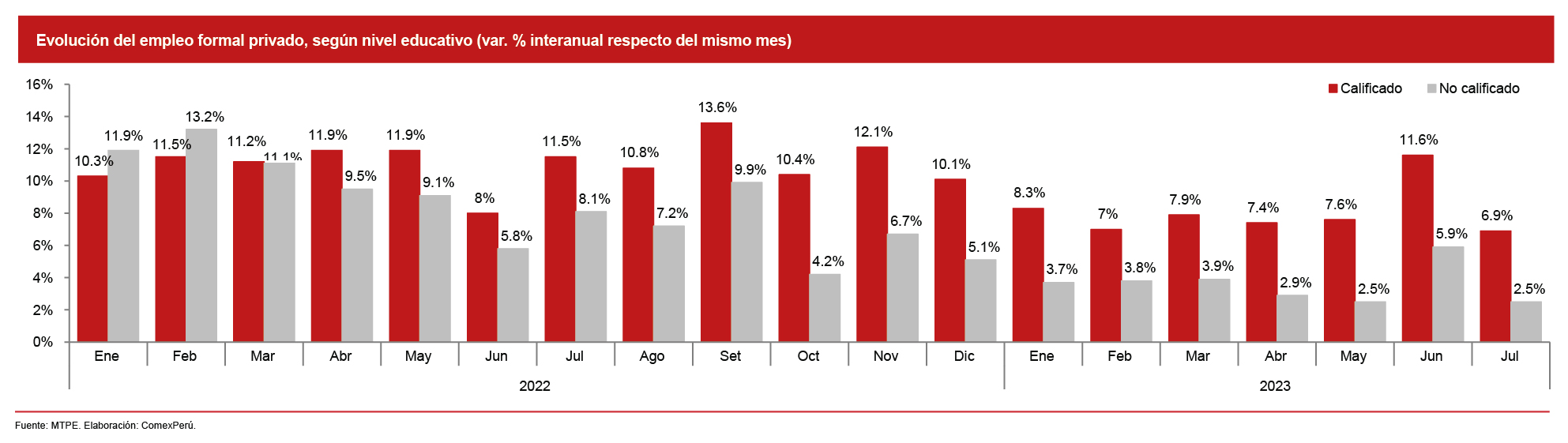De acuerdo con el Ministerio de Trabajo y Promoción del Empleo (MTPE), la cantidad de empleos formales en el sector privado mantiene un crecimiento constante en lo que va del año, con una tasa de crecimiento promedio del 4.6% para el periodo enero-julio. Sin embargo, debido a la menor dinamismo económico que cada vez empeora más, estos resultados podrían revertirse en los próximos meses. Por el lado de las contrataciones, estas comenzaron a desacelerarse, sobre todo para los trabajadores no calificados (es decir, aquellos sin educación superior completa), quienes suelen ser los más afectados en escenarios de contracción económica.