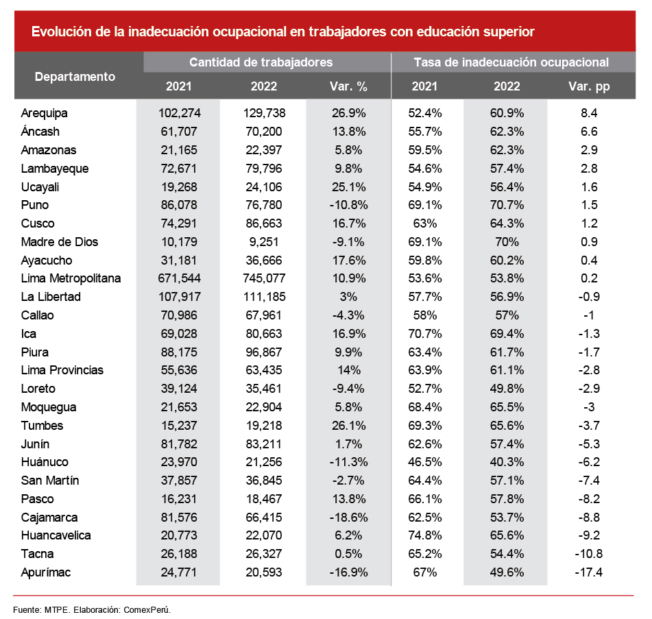 Durante el año pasado, la tasa de inadecuación ocupacional aumentó en 10 departamentos y el caso más grave fue el de Arequipa, con el 60.9% (+8.4 puntos porcentuales respecto de 2021). En este departamento, la cantidad de trabajadores con educación superior en esta situación aumentó a 129,738 (+26.9%). Por su parte, Áncash fue el segundo que más retrocedió, con un aumento en la incidencia al 62.3% (+6.6 pp), seguido por Amazonas con el 62.3% (+2.9 pp).