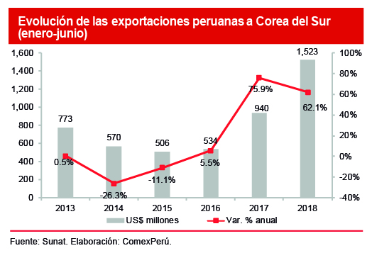 Como todo acuerdo comercial, uno de los objetivos del mencionado ALC fue incrementar el flujo de comercio entre ambos países. En esa línea, y tal como lo discutimos en el Semanario N.º 929, de acuerdo con cifras de la Sunat, entre 2011 y 2017, las exportaciones peruanas a Corea del Sur crecieron un 26% en términos acumulados, una tasa promedio anual del 4%. Más aún, en los primeros seis meses de 2018, dicho país se ubicó tercero en nuestro ranking de envíos, con un valor de US$ 1,523 millones, lo que representó un crecimiento del 62.1% con respecto al mismo periodo de 2017.