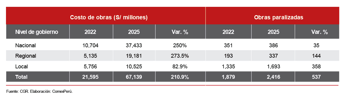En los últimos cuatro años, el capital comprometido en obras públicas paralizadas se triplicó, al pasar de S/ 21,595 millones en marzo de 2022 (2,379 obras) a un pico histórico de S/ 67,139 millones al cierre de 2025 (2,426 obras), según datos expuestos por la Contraloría General de la República (CGR).
