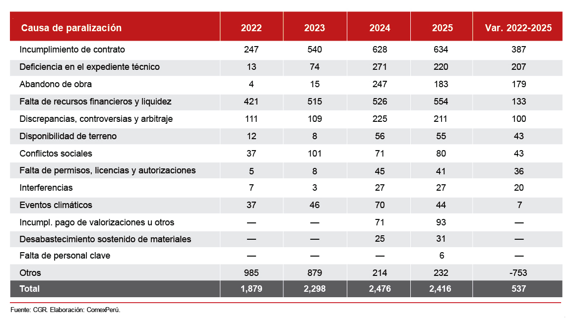 Entre 2022 y 2025, las causas que registraron el mayor incremento en número de obras paralizadas fueron el incumplimiento de contrato, el abandono de obra y la deficiencia en el expediente técnico. La primera pasó de 247 a 634 obras paralizadas, y se consolidó como la causa dominante, con un incremento de 387 proyectos. Las deficiencias en el expediente técnico emergieron como una causa de creciente preocupación al escalar de apenas 4 a 183 obras (+179), mientras que el abandono de obra, por su parte, pasó de 4 a 183 casos (+179), lo que refleja un problema estructural en la calidad de la planificación técnica previa a la ejecución.