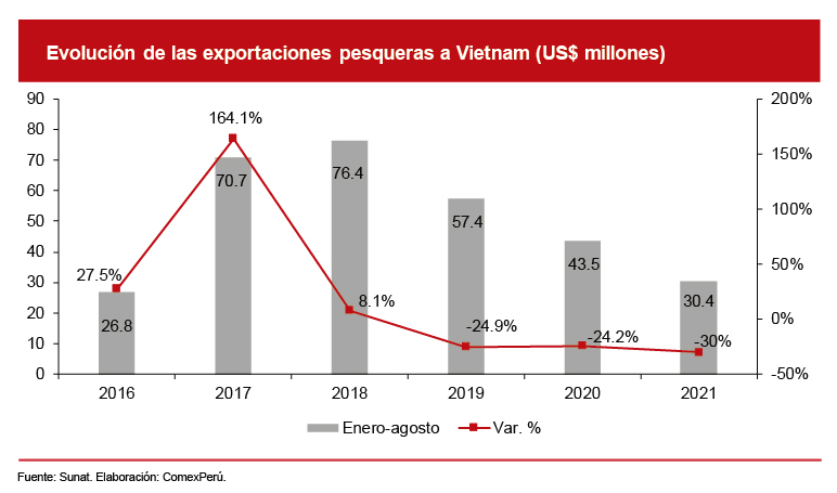 Si hablamos de sectores productivos, la entrada en vigor del tratado representa un potencial beneficio para el sector pesquero. De acuerdo con PromPerú, países como Vietnam se caracterizan por un elevado consumo de productos de la pesca. Las exportaciones del sector (tradicional y no tradicional) fueron de US$ 30.4 millones en el periodo enero-agosto 2021, un 30% menos que lo registrado en 2020. Este sector tuvo un crecimiento promedio del 28.5% entre 2015 y 2019, pero se vio afectado en 2020 y 2021, pues tuvo contracciones del 24.2% y el 30%, respectivamente.