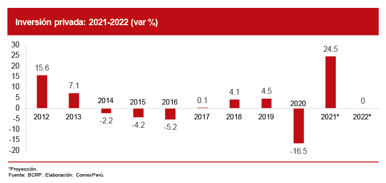 En ese sentido, la corrección a la baja de la inversión privada, expuesta en el último reporte, resulta preocupante. Como se observa en el gráfico, se estima que la inversión crezca un 24.5% en el presente año; no obstante, para 2022, la tasa de crecimiento sería 0%.