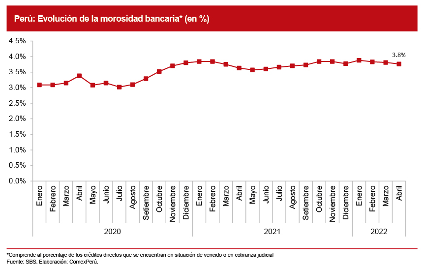 Por otro lado, la morosidad bancaria (porcentaje de los créditos directos que se encuentran en situación de vencido o en cobranza judicial) fue del 3.8% en abril de 2022. Esto fue un 0.13 pp. más que lo registrado en el mismo mes de 2021.