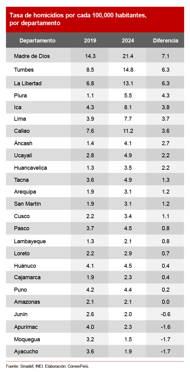 Por otro lado, datos del Sistema Nacional de Defunciones (Sinadef) muestran que la tasa de homicidios pasó de 3.5 en 2019 a 6.1 en 2024, un incremento del 74%. Los departamentos con los mayores aumentos fueron Madre de Dios, con 21.4 homicidios por cada 100,000 habitantes (+7.1 respecto a 2019); Tumbes, con 14.8 (+6.3); La Libertad, con 13.1 (+6.3); Piura, con 5.5 (+4.3); e Ica, con 8.1 (+3.8).