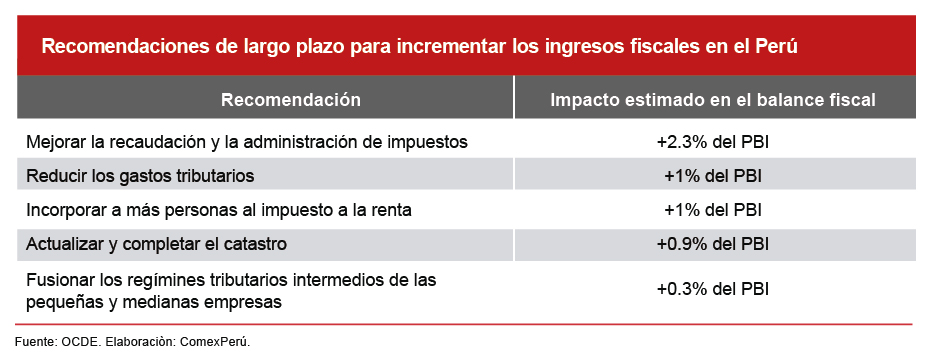 La misma OCDE da luces sobre esta pregunta en su más reciente informe con recomendaciones de política diseñadas para el proceso de adhesión del Perú. Por el lado fiscal, sus recomendaciones van de la mano con su impacto estimado en el balance fiscal en el largo plazo. Solo enfocándonos en aquellas con un impacto positivo[1], vemos que la más importante de todas consiste directamente en mejorar la administración y recaudación de impuestos, mientras que la menos relevante es la de fusionar los regímenes tributarios de las pequeñas y medianas empresas.