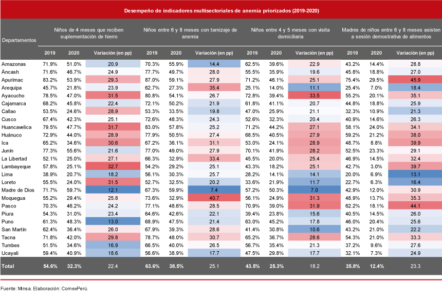 En 2020, se establecieron algunas medidas de contención para ayudar a los esfuerzos de la estrategia, el Minsa aprobó el Plan de Recuperación de Brechas en Inmunizaciones y Anemia en tiempo de COVID-19, y el Midis creó un subsidio mensual de S/ 100, denominado Apoyo Temporal para el fortalecimiento del Desarrollo Infantil, gestionado por el Programa Juntos. Sin embargo, los resultados parecen ser desalentadores a nivel departamental, con Apurímac, Ayacucho, Huánuco, Ica, La Libertad, Moquegua y Tacna como los departamentos con el peor desempeño en la mayoría de los indicadores priorizados de anemia respecto de 2019.