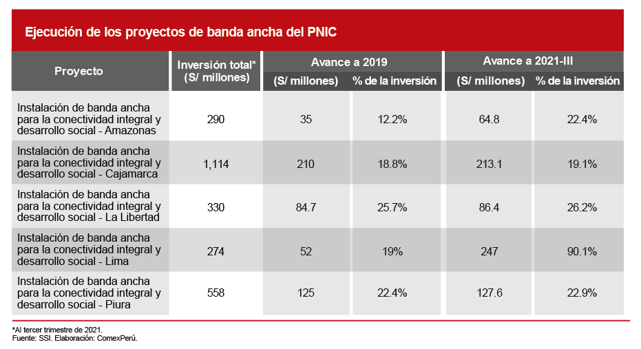 Es preocupante que cuatro de los cinco proyectos de instalación de banda ancha tengan niveles bajos de avance, tras más de dos años de la publicación del PNIC, y que se tengan dos paralizados. Se necesita redoblar esfuerzos para empujar el avance del PNIC, en especial por parte del Ministerio de Transportes y Comunicaciones, además de otras entidades relacionadas con el sector. Necesitamos mejorar la ejecución para el beneficio de la población.