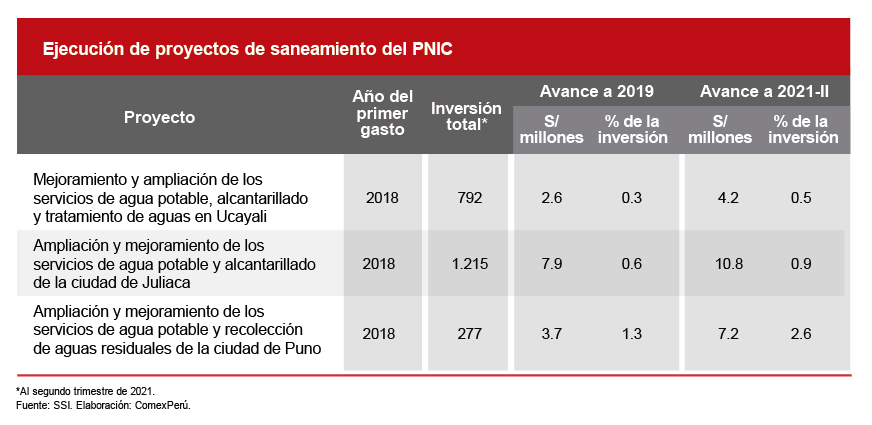 Entre los proyectos del sector saneamiento, está la Planta de Tratamiento de Aguas Residuales Titicaca (PTAR Titicaca), cuya inversión total es de S/ 1,187 millones, con un avance del 0.1% al primer semestre de 2021, de acuerdo con el Sistema de Seguimiento de Inversiones (SSI) del Ministerio de Economía y Finanzas. Afortunadamente, no hay puntos críticos con este proyecto, ya que sus obras comenzaron en abril del presente año, lo que explica su pequeña ejecución, y actualmente, procede con normalidad.