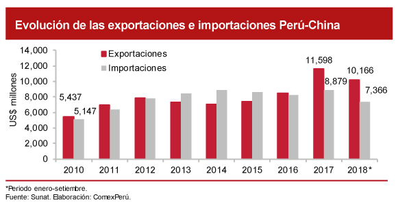 Desde que el TLC entre Perú y China entró en vigor en 2010, nuestros envíos a China se han incrementado de US$ 5,437 millones en ese año a US$ 11,598 millones en 2017, lo que significa un crecimiento acumulado del 113% y una tasa de crecimiento promedio anual de 11.4% en el periodo 2010-2017, según cifras de la Sunat. Con respecto a las importaciones desde China, estas han aumentado de US$ 5,147 millones a US$ 8,879 millones en el mismo periodo, con un crecimiento acumulado del 72.5% y una tasa de crecimiento promedio anual del 8.1%. Asimismo, en el periodo enero-setiembre de 2018, según la Sunat, China se posiciona como nuestro principal mercado de destino, con un monto exportado de US$ 10,166 millones (29% del total), así como el principal mercado de origen de nuestras importaciones, con un monto de US$ 7,366 millones (23% del total).