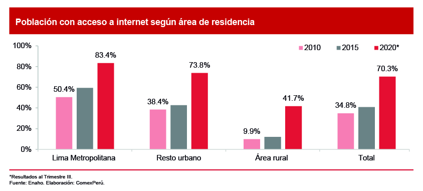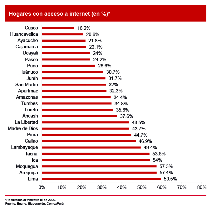 Según cifras de la Encuesta Nacional de Hogares (Enaho), al tercer trimestre de 2020, el 70.3% de la población de seis años contaba con acceso a internet. Pero esta mejora en el acceso se ha concentrado principalmente en la capital peruana. Así, mientras que a nivel de Lima Metropolitana el valor de este indicador ascendió al 83.4%, en las zonas rurales del país solo alcanzó un 41.7%. Un caso similar se observa en el caso del acceso de internet en los hogares a nivel departamental, en el que Cusco (16.2%), Huancavelica (20.6%) y Ayacucho (21.8%) registraron menores porcentajes. A esta poca cobertura en el interior del país se suma la baja calidad del servicio ofrecido. Por ejemplo, más de la mitad de las conexiones de internet en 13 departamentos están por debajo del umbral mínimo aceptado (ver Semanario 1048).