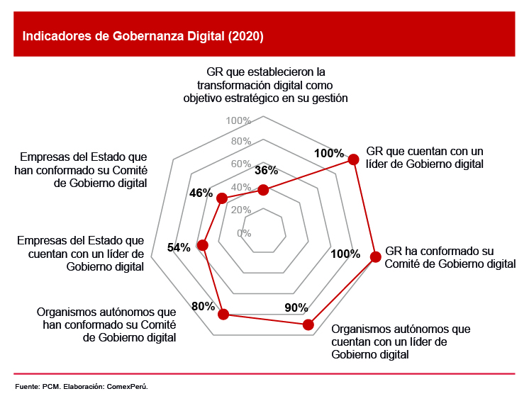 Aunque el reto todavía está en contar con indicadores que permitan medir la situación actual y monitorear el progreso futuro, a la fecha se ha realizado el esfuerzo de medir los avances en gobernanza digital, innovación digital, confianza digital y la gestión del Gobierno digital a través de los servicios de interoperabilidad. Los esfuerzos apuntan a que el proceso de transformación digital en el país es una realidad. De acuerdo con cifras de la PCM, durante 2020, tenemos más de 180 líderes de Gobierno digital en Gobiernos locales a nivel nacional. Por su parte, todos los Gobiernos regionales cuentan con líderes de Gobierno digital, pero solo un 36% de estos establecieron la transformación digital como objetivo estratégico en su gestión. Si bien hay avances a nivel de indicadores, el año pasado el Ejecutivo público más de 100 normas sobre este tema, con lo que lo posicionó en la agenda del Gobierno como una prioridad.