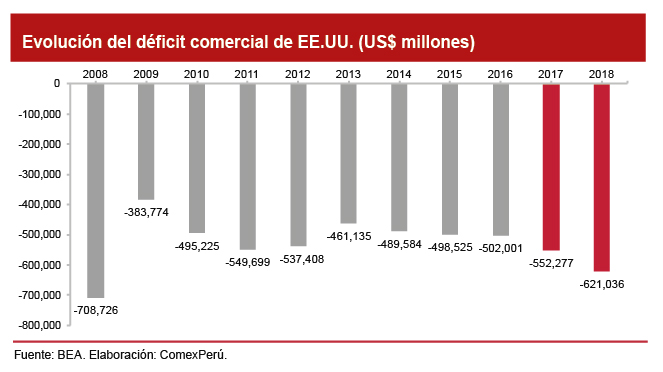 Sin embargo, resulta anecdótico observar que, pese a esta política de proteccionismo comercial, el déficit comercial de EE.UU. aumentó significativamente. Según cifras de la Oficina de Análisis Económico de ese país (BEA, por sus siglas en inglés), en 2018, este déficit se incrementó un 12.5%, hasta alcanzar la cifra de US$ 621,036 millones (3% de su PBI). Esto representa el peor resultado desde 2008, cuando alcanzó un déficit comercial de US$ 708,726 millones, y hace evidente que la política proteccionista del Gobierno de Trump no está cumpliendo su objetivo; por el contrario, las importaciones de EE.UU. se incrementaron un 6.8% en 2017 y un 7.5% en 2018, por encima de las exportaciones, que aumentaron un 6.1% y un 6.3%, respectivamente.