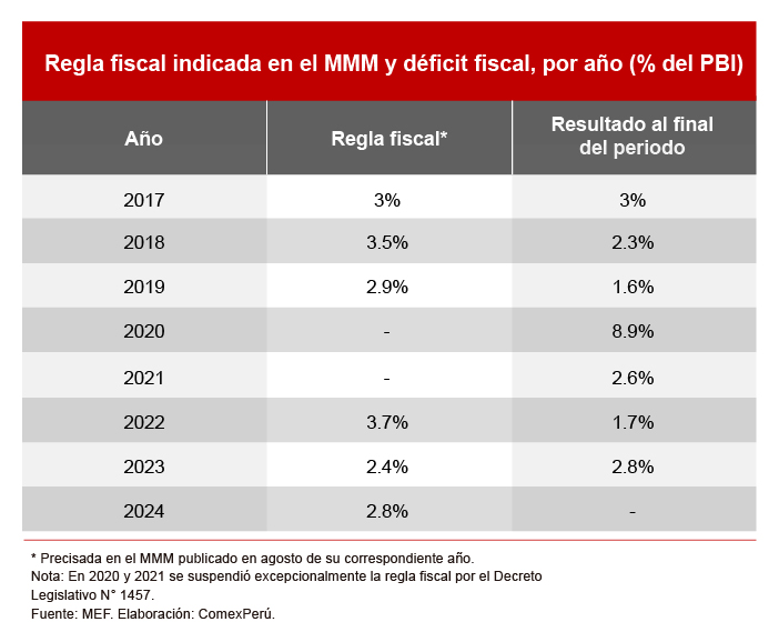 La Ley N.° 31541, aprobada en agosto de 2022, inicialmente fijó el déficit fiscal para 2024 en un 2% del PBI, regla que se mantuvo en las proyecciones del Marco Macroeconómico Multianual (MMM) 2024-2027. Posteriormente, en el Informe de Actualización de Proyecciones Macroeconómicas (IAPM) 2024-2027, se ajustó esta regla, elevándola al 2.5% del PBI. En julio de este año, el Decreto Legislativo N.° 1621 volvió a aumentar la regla fiscal, esta vez al 2.8% del PBI, como se precisó en el MMM 2025-2028. Este último aumento está asociado con el desembolso adicional de S/ 3,000 millones en créditos suplementarios destinados a financiar gastos relacionados con la reactivación económica, aprobado por la Ley N.° 32103 a fines de julio.