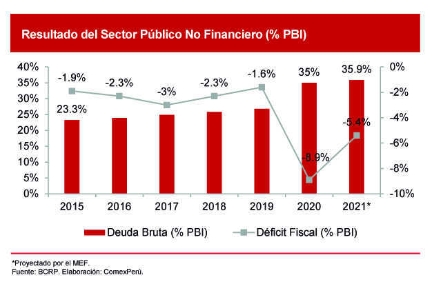 Sin embargo, debido a la pandemia de COVID-19, en 2020 se suspendieron temporalmente las reglas fiscales. Se dieron estímulos fiscales grandes como la medida temporal que suspendía o reducía los pagos del impuesto a la renta, transferencias a las familias, etc. Además, la menor actividad económica también tuvo como consecuencia una menor recaudación. Así, estos factores hicieron que el déficit fiscal para el año 2020 sea un 8.9% del PBI y la deuda pública sea del 35%, según cifras del BCRP. Para contextualizar estos resultados, no se veía unos parecidos desde finales de la década de 1980, durante el primer gobierno del expresidente García.