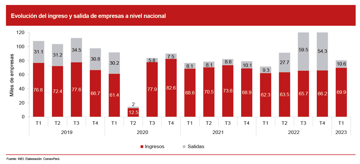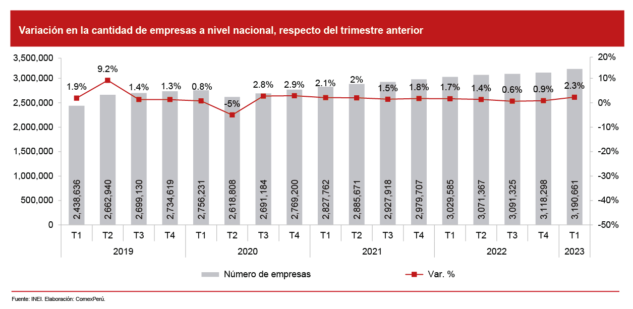 Según el último informe de demografía empresarial del Instituto Nacional de Estadística e Informática (INEI), el número de empresas activas a nivel nacional alcanzó un total de 3.2 millones al 31 de marzo de 2023, lo que reflejó un aumento interanual del 5.3% en comparación con el mismo período de 2022. Cabe precisar que, en el periodo de análisis, se constituyeron 69,901 empresas (+12.2%) y 10,617 empresas se dieron de baja (+14.1%), lo que significó una variación neta de 59,284 empresas.