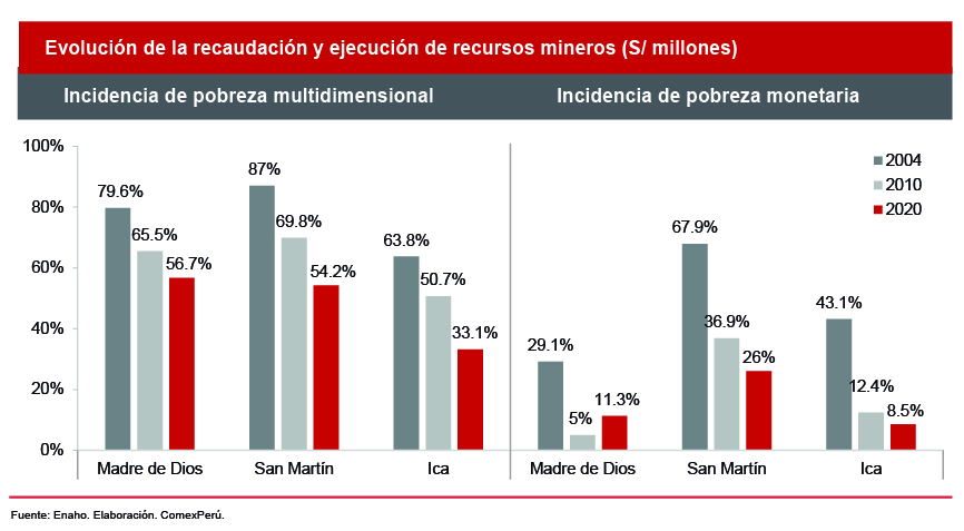 Ahora bien, de las estimaciones realizadas, resaltan los departamentos con mayores diferencias en su pobreza multidimensional respecto de su pobreza monetaria. Estos son Madre de Dios (56.7% vs. 11.3%), San Martín (54.2% vs. 26%) e Ica (33.1% vs. 8.5%). En otras palabras, el crecimiento económico experimentado en estos departamentos durante los últimos años ha permitido incrementar los ingresos de muchos peruanos hasta salir de la pobreza; pero, si bien las condiciones de vida también han mejorado, aún queda mucho trabajo por realizar para cerrar estas brechas.