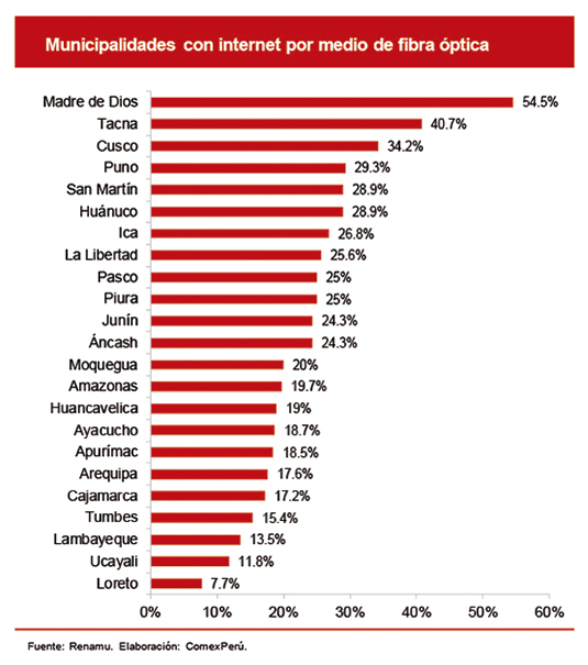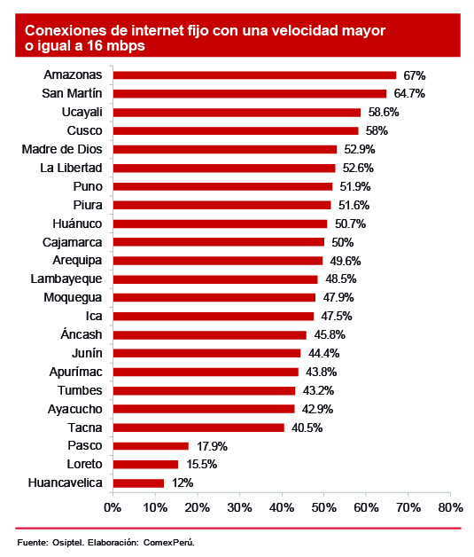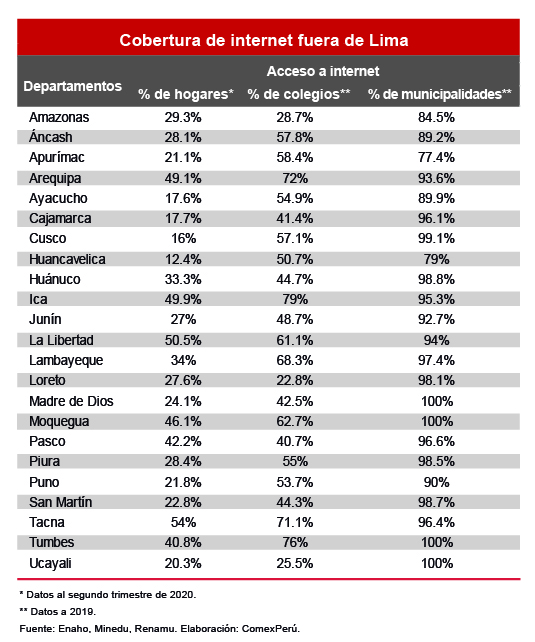 Si vamos a casos concretos, sobresalen los bajos niveles en la selva, especialmente en Amazonas, Loreto y Ucayali, con porcentajes menores al 30% en hogares y colegios, y los dos primeros sin el 100% de municipalidades cubiertas. Del mismo modo, resaltan algunos departamentos de la sierra, como Ayacucho, Cajamarca, Cusco y Huancavelica, con menos del 20% de hogares con acceso a internet; y este último, más Apurímac, con menos del 80% de municipalidades cubiertas.