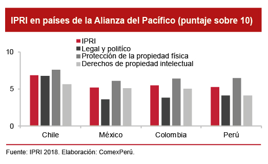 Por otro lado, de acuerdo con el Índice Internacional de Derechos de Propiedad 2018 (IPRI, por sus siglas en inglés), de la Property Rights Alliance, nuestro país se ubicó en el puesto 69, de un total de 125 países a nivel mundial, luego de ocupar el puesto 65 en 2017. Cabe mencionar que, a nivel de Latinoamérica y el Caribe, nos ubicamos en la posición 9 de 20 países, y si nos comparamos con los demás países de la AP, tenemos que Chile lidera el ranking en la región y se ubica en el puesto 29 en el mundo; Colombia se ubica en el puesto 8 a nivel regional, pero 61 en el mundo; y México está en el puesto 10 en la región, pero 72 en el mundo. Asimismo, cabe resaltar que los países que presentan las mejores puntuaciones mundiales en el IPRI 2018 son Finlandia, Nueva Zelanda y Suiza.