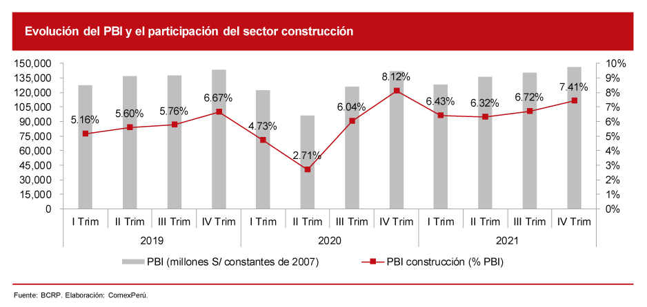La construcción se vio afectada en el segundo trimestre de 2020 por la pandemia de COVID-19. Perdió dinamismo y disminuyó su contribución a la economía nacional. No obstante, a partir del cuarto trimestre de 2020, este sector ha ido incrementando gradualmente su contribución hasta alcanzar un 7.41% del PBI en el último trimestre de 2021, en comparación con el 2.71% del segundo trimestre del mismo año.