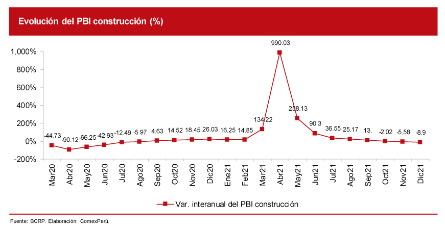 Entre marzo y agosto de 2020, el PBI del sector construcción tuvo un crecimiento interanual negativo en cada mes del periodo. Posteriormente, en abril de 2021, experimentó un crecimiento excepcional del 990%, resultado que se debería a que la construcción y el desarrollo de proyectos inmobiliarios formaron parte de la primera fase de la reactivación económica del país. No obstante, en el último trimestre de 2021, el sector perdió dinamismo, pues el PBI construcción nuevamente presentó tasas de crecimiento interanuales negativas hasta el último mes del año.
