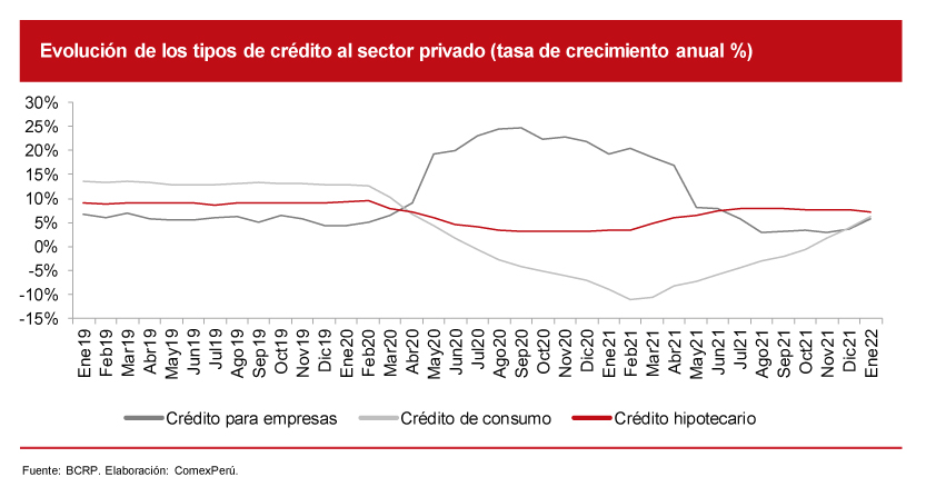 Culminado 2021, se habría logrado un crecimiento del 63.7% en la colocación de créditos hipotecarios con respecto a 2020, según el IEC. De los 49,520 créditos hipotecarios otorgados en 2021, el 74% fueron financiados por entidades financieras y el 26% restante, por recursos del Fondo Mivivienda. Asimismo, se espera que los desembolsos de este tipo de crédito continúen en aumento en el presente año, gracias a la mayor liquidez que poseen los individuos.