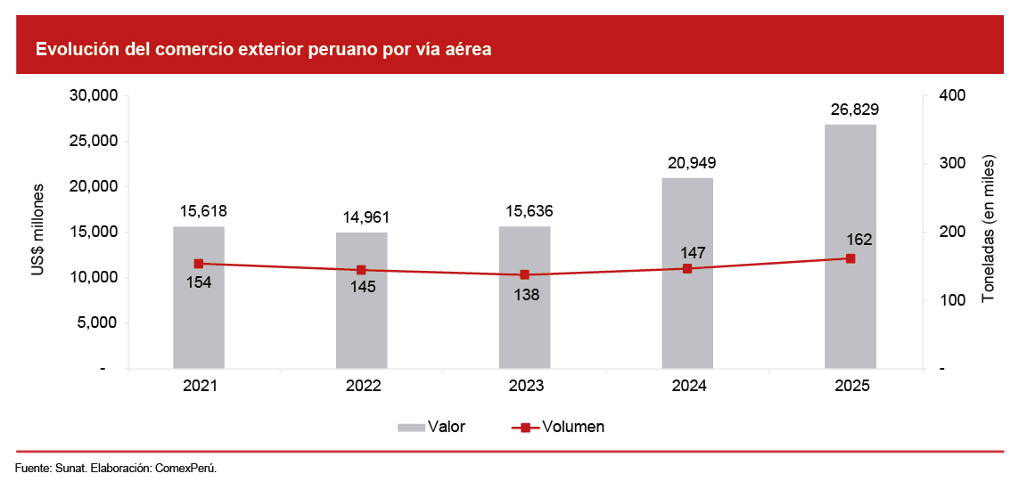 A partir de 2024, se observó un cambio en esta dinámica. Ese año, el valor del comercio exterior aéreo ascendió a US$ 20,949 millones y el volumen alcanzó 146,931 TM, lo que representó un crecimiento interanual del 33.9% y el 6.8%, respectivamente. Esta evolución se consolidó en 2025, cuando el valor movilizado por esta vía registró US$ 26,829 millones y el volumen total llegó a 161,859 TM, lo que reflejó un mayor dinamismo del comercio exterior aéreo en términos tanto de valor (+28.1%) como de carga transportada (+10.2%).
