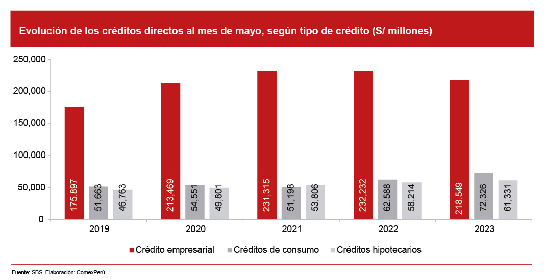 De acuerdo con la Superintendencia de Banca, Seguros y AFP (SBS), a mayo de 2023, los créditos directos[1] de la banca múltiple sumaron S/ 352,207 millones, lo que evidenció una caída del 0.2% con respecto al mismo periodo de 2022. Este resultado obedece, principalmente, a una reducción en los créditos de comercio (-8.5%), industria manufacturera (-3.8%) y otras actividades empresariales (-8.5%). Por su parte, los créditos de consumo (+15.6%) e hipotecario (+5.4%) contrarrestaron dicha caída, aunque en una menor proporción del total de préstamos.