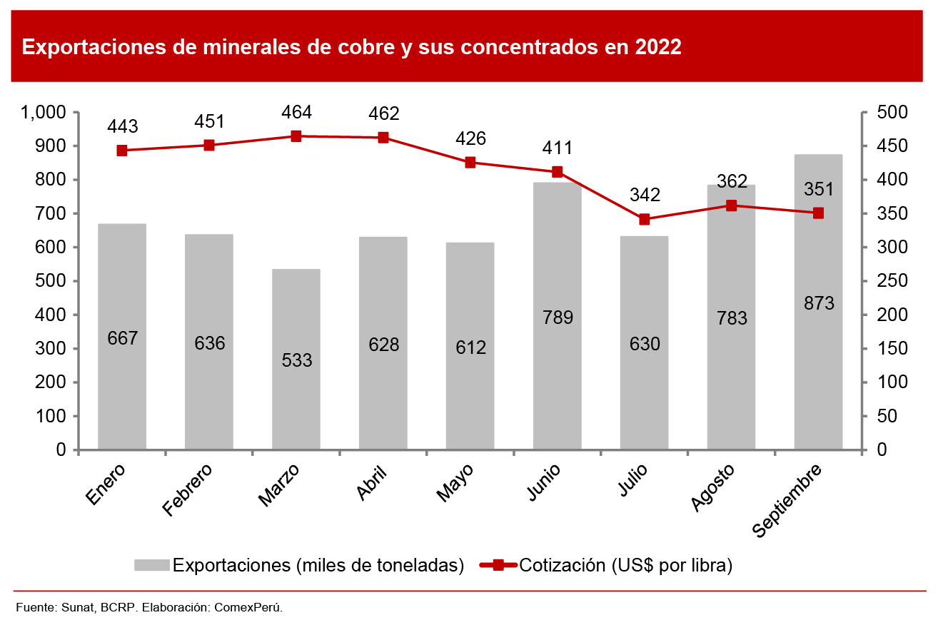 El motivo de estos resultados es que, durante el tercer trimestre del año, se enviaron 2.3 millones de toneladas de cobre, concentrados y minerales que enfrentaron los menores precios registrados en lo que va del año. Sin embargo, en setiembre destacaron los envíos, con 872,700 toneladas, el mejor resultado mensual, pero la cotización internacional del cobre se situó en US$ 351 por libra, el segundo precio más bajo del año, según el Banco Central de Reserva del Perú (BCRP).