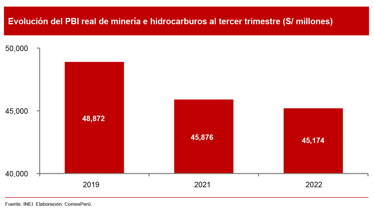 De acuerdo con el Instituto Nacional de Estadística e Informática (INEI), la producción del sector minería e hidrocarburos alcanzó los S/ 45,174 millones a precios constantes de 2007 durante los primeros tres trimestres del año, es decir, acumuló una contracción del 1.5% con respecto al mismo periodo de 2021. Debido a esto, el PBI real del sector continúa rezagado respecto a los niveles prepandemia y se situó un 7.5% por debajo del resultado de 2019. Cabe resaltar que en este sector sobresale la participación de la minería metálica, que explica el 84.6% de su producción, según el INEI.