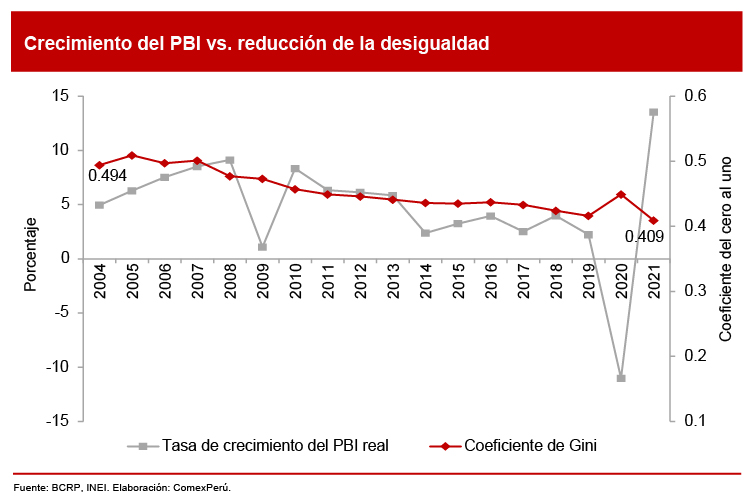 Si miramos dichas cifras, la reducción de la desigualdad en el país es clara. En casi todos los años del presente siglo, el coeficiente de Gini ha sido cada vez menor, con la gran excepción, comprensiblemente, del año 2020, como producto de la pandemia de COVID-19. Ahora bien, reducir la desigualdad se ha vuelto más difícil en los últimos años, algo que ha ido de la mano con las menores tasas de crecimiento del PBI. De hecho, si comparamos ambas variables, se puede observar que, en general, las caídas más marcadas del coeficiente se produjeron durante los años con mayores tasas y viceversa, lo que habla de la importancia del crecimiento económico para mejorar los ingresos de la población.