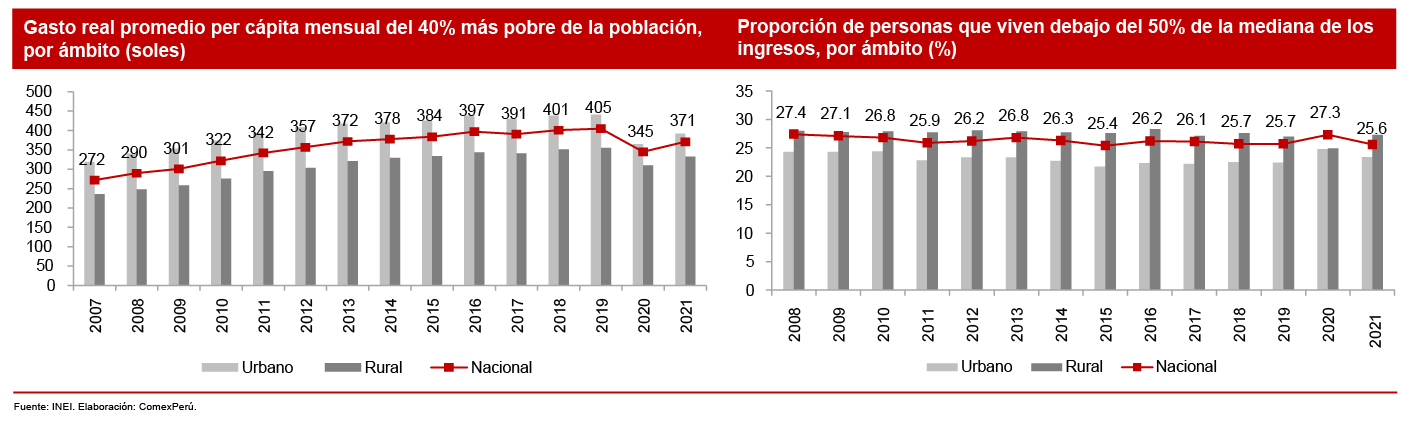 El desarrollo de ambas variables en el tiempo denota una realidad compleja respecto de la desigualdad. Por un lado, el gasto por persona del 40% más pobre ha aumentado casi continuamente hasta antes de 2020, lo que refleja una mejora efectiva en los recursos disponibles de este grupo. Sin embargo, existe una clara disparidad entre el ámbito urbano y el rural, cuya reducción más grande solo se produjo debido a la pandemia. Por otro lado, la proporción de personas con ingresos menores al 50% de la mediana ha permanecido relativamente constante, al girar alrededor de un poco más del 25% (1 de cada 4 personas), sin una gran diferencia entre los ámbitos geográficos.