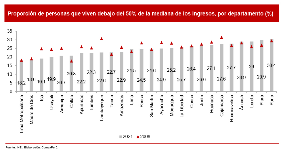 Lo mencionado se explica porque, si bien una parte importante de personas con bajos ingresos ha visto que estos son mayores con el paso de los años, esto no ha generado grandes cambios en la posición relativa que poseen con respecto a los ingresos del resto de la población. Por supuesto, ello no es necesariamente una constante a lo largo del país. Si desagregamos los datos de la segunda variable por departamentos, se observa que, en varios casos, como Lambayeque, Ica, Ucayali y Arequipa, ha habido mejoras sustanciales con relación al pasado. No obstante, al mismo tiempo, existen departamentos cuya situación ha empeorado, al igual que sobresalen aquellos con porcentajes altos, como Puno, Piura, Loreto o Áncash.