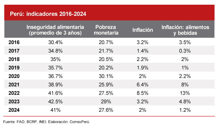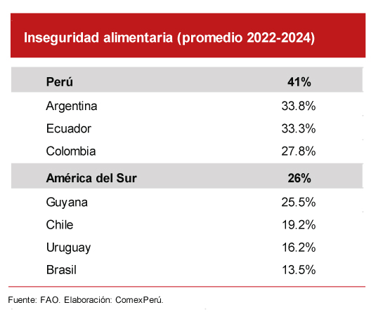 La inseguridad alimentaria ocurre cuando las personas carecen de alimentos o consumen alimentos menos nutritivos por falta de recursos económicos. Según la Organización de las Naciones Unidas para la Alimentación y la Agricultura (FAO, por sus siglas en inglés) a julio de 2025, el 41% de la población peruana experimentó inseguridad alimentaria entre 2022 y 2024, la cifra más alta de América del Sur para los países con información disponible. Si bien es una leve mejora con respecto al promedio de tres años registrado a 2023 (42.5%), el Perú sigue estando lejos de su nivel prepandemia (35.7%) y de su mejor registro, del 30.4% en 2016.