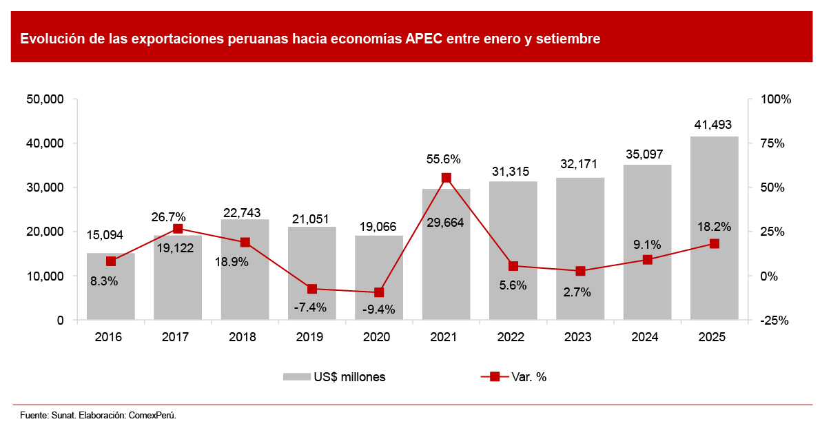 Las exportaciones peruanas hacia las economías del Foro de Cooperación Económica Asia-Pacífico (APEC, por sus siglas en inglés) mostraron un crecimiento entre enero y setiembre de 2025, mientras se consolidan nuevas oportunidades comerciales en Asia: China, Filipinas y Tailandia.
