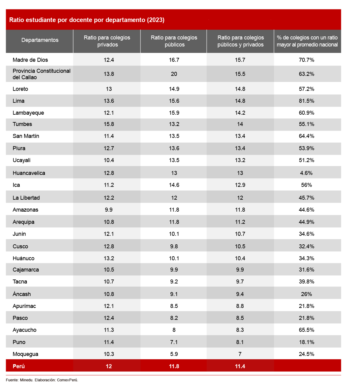 En 2023, el Perú presentó un promedio nacional de 11.4 estudiantes por docente en la educación secundaria de colegios escolarizados activos, de acuerdo con cifras de la plataforma de Estadística de la Calidad Educativa (Escale) del Ministerio de Educación. Sin embargo, este promedio varía en el interior del país. Madre de Dios reporta la ratio más alta, con 15.7, seguido de la provincia constitucional del Callao, con 15.5 estudiantes por docente. Luego, se encuentran Lima y Loreto, con una ratio de 14.8.