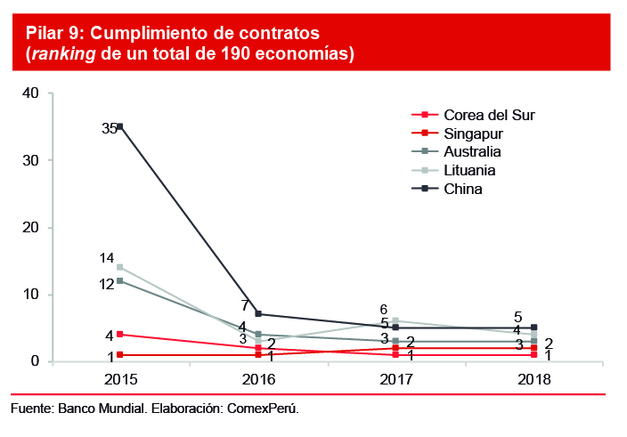 Las características más comunes de las reformas en estas economías han sido la creación de un sistema electrónico para interponer la demanda inicial, así como para resolver litigios de manera transparente. El BM destaca la reforma realizada por Corea del Sur, la cual facilitó la presentación de un caso comercial mediante la introducción de un sistema electrónico. Por su parte, China hizo más fácil el cumplimiento de los contratos al enmendar su código de procedimiento civil para racionalizar y acelerar todos los procedimientos judiciales, así como también reforzó su sistema de ejecución de contratos al endurecer las normas sobre la ejecución de sentencias, con el fin de limitar las formas en que los deudores pueden ocultar activos y escapar de la ejecución.