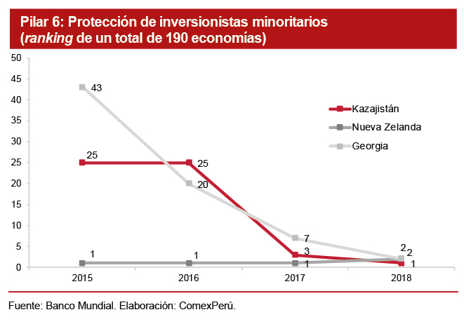 La extrema mejora en la posición de los dos primeros países se debe a la aprobación de reformas que favorecieron la transparencia y el alcance de sus normas relacionadas con estos temas. Concretamente, en Georgia se aumentaron los requerimientos de divulgación de información antes de realizar transacciones, se facilitó el acceso a información corporativa durante los procesos judiciales, además se dispuso la responsabilidad de los directores en casos de transacciones que representen un conflicto de interés y que perjudiquen a los accionistas minoritarios. Por su parte, Kazajistán volvió imperativa la publicación de información relacionada con las operaciones contenidas en la memoria anual de la empresa y facilitó los procedimientos relacionados con el inicio de demandas judiciales contra directores en casos de operaciones vinculadas que perjudiquen a la empresa.