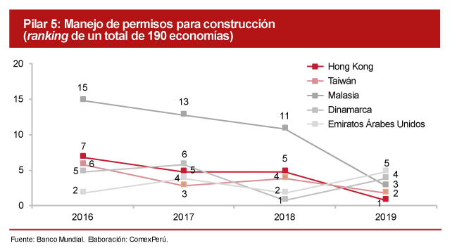 Las 5 economías que encabezaron el ranking fueron Hong Kong, Taiwán, Malasia, Dinamarca y Emiratos Árabes Unidos. A lo largo de los años, estos cinco países han implementado una serie de reformas exitosas con las que han logrado simplificar y agilizar el proceso de obtención de permisos de construcción. A manera de ejemplo, Hong Kong, Taiwán y Malasia redujeron el tiempo requerido para obtener un permiso de construcción estableciendo centros integrales para atender distintas aplicaciones en un mismo lugar. Taiwán, además, mejoró recientemente la eficiencia de su centro de ventanilla única, lo que facilita aún más el proceso. Asimismo, Hong Kong, líder del ranking, desarrolló el programa Be the smart regulator, que busca mejorar la eficiencia, la transparencia y hacer más amigable el sistema de obtención de licencias del Gobierno. De esta manera, eliminó procedimientos relacionados con las inspecciones y preaprobaciones de construcción. Por su parte, Emiratos Árabes Unidos implementó un sistema online para obtener permisos de construcción y certificados, y fortaleció el control de calidad de las construcciones, con lo que obtuvo el máximo puntaje en este indicador.