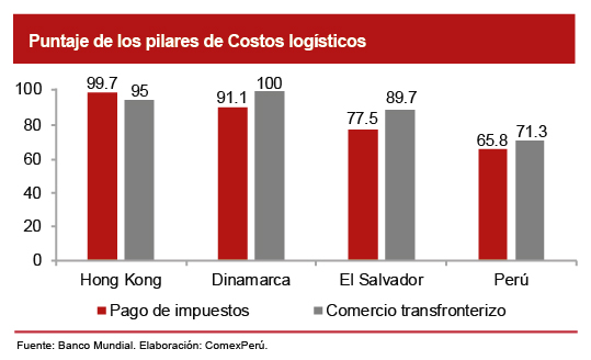 El Perú ocupa el puesto 108 en el puntaje promedio del grupo Costos logísticos, una mejora en comparación con el año pasado. Nuestro país se ubica en la posición 121 y 102 en los pilares de Pago de impuestos y Comercio transfronterizo, respectivamente. Además, se encuentra rezagado en comparación con las economías de la Alianza del Pacífico, ya que Chile ocupa el puesto 75 del ranking mundial del grupo, y México, el puesto 88. Por tanto, el Perú solo supera a Colombia, que ocupa el puesto 147.