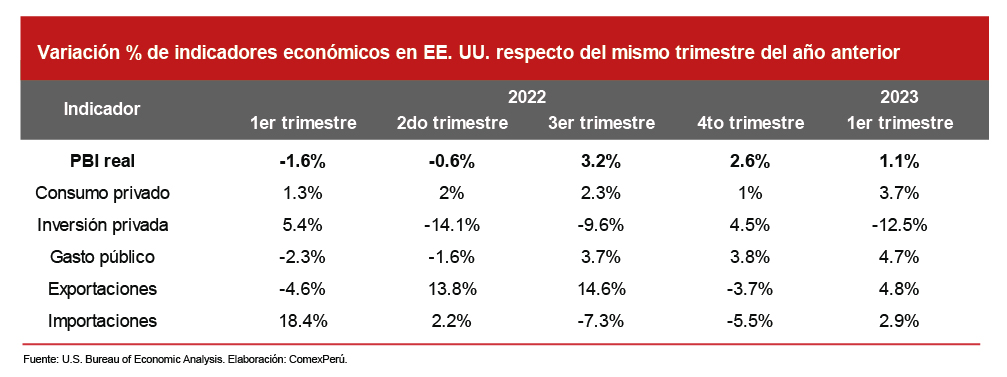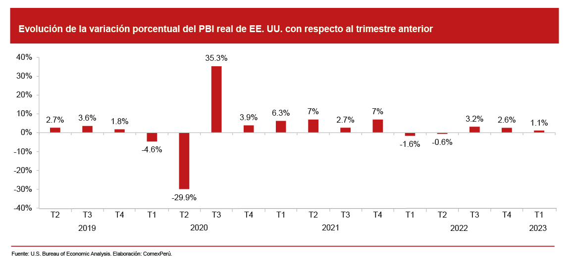 El pasado jueves 27 de abril, la Oficina de Análisis Económico (BEA, por sus siglas en inglés), agencia del Departamento de Comercio de los EE. UU., informó que, según estimaciones del primer trimestre del año, el PBI real estadounidense aumentó a una tasa anual desestacionalizada del 1.1%. Cabe destacar que, en el cuarto trimestre de 2022, el PBI real mostró un incremento del 2.6%, por lo que la cifra correspondiente al primer trimestre de 2023 implicaría un menor dinamismo de la economía, aunque tuvo una mejora con respecto al primer trimestre de 2022, cuando este registró una caída del 1.6%. En este contexto, existiría la posibilidad de que la economía de EE. UU. presente resultados menos favorables en los siguientes trimestres o incluso una recesión.