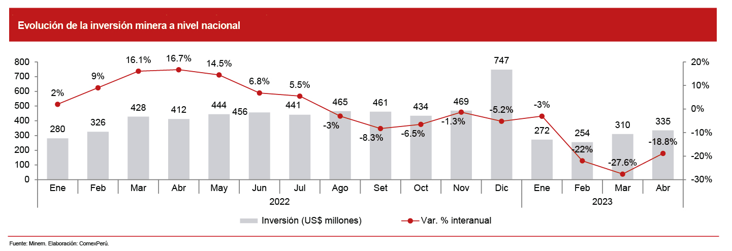 Sin embargo, este desempeño sería afectado por los menores niveles de inversión en el sector. De acuerdo con estimaciones del Banco Central de Reserva del Perú (BCRP), la inversión minera se contraería un 18.9% durante 2023, lo cual sería el principal motivo detrás de las menores expectativas de inversión privada total. De acuerdo con el Minem, la inversión minera descendió a US$ 335 millones (-18.8%) en abril y mantiene una tendencia negativa desde agosto del año pasado, lo que alertaría de un resultado negativo al cierre de 2023.